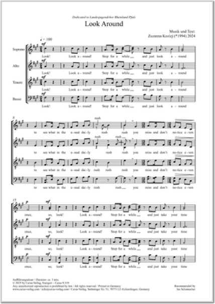 Look Around ist ein Stück für vierstimmigen gemischten Chor der polnischen Komponistin und Arrangeurin Zuzanna Koziej. Die Botschaft des Werkes ist nachdenklich: Koziej ruft uns dazu auf, zu pausieren, das Bewusstsein zu schärfen und die Schönheit der Welt zu genießen, statt in Alltagsroutinen zu versinken und durch das Leben zu hetzen.