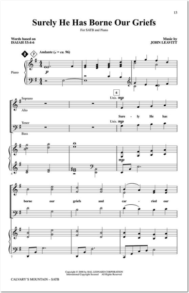 John Leavitt has created a cantata designed for Lent and Holy Week. Titles include: What Wondrous Love Is This, Were You There, Surely He Has Borne Our Griefs, Alas! And Did My Savior Bleed and Jesus Died on Calvary'sMountain. Available separately: SATB, ChoirTrax CD, Chamnber Orchestra score and parts (fl 1/2, ob, cl 1/2, bn, perc 1 and 2, hp, str:88442), Preview CD, Preview Pak. Duration: ca. 30:00.