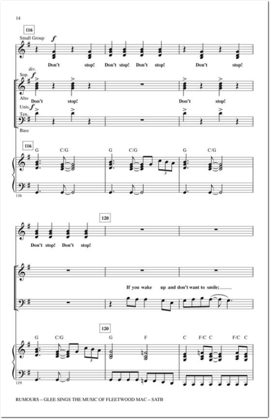 In Season Two, the Glee cast devoted a full episode dedicated Fleetwood Mac's 1977 hit-powerhouse, Rumours. Opening with the bright pop sounds of “I Don't Want to Know,” it moves into the sultry“Dreams,” and building into “Don't Stop,” this 6-minute choral tribute spans the generations in its appeal! Available separately: SATB, 3-Part Mixed, 2-Part, ShowTrax CD. Combo parts available digitally(tpt 1, tpt 2, tsx, tbn, syn, el gtr, ac gtr, b, dm). Duration: ca. 5:45.