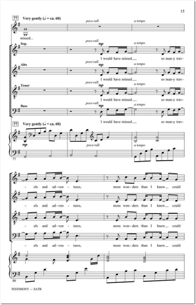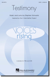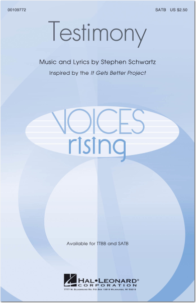 This is a breathtaking and emotional new work composed by Stephen Schwartz for the San Francisco Gay Men's Chorus, conducted by Timothy Seelig. Inspired by the heartfelt words of the It Gets Better Project, Testimony speaks to anyone who has ever felt out of place. A powerful work of affirmation and inclusion! Also available for TTBB (set in different key). Duration: ca. 7:30.