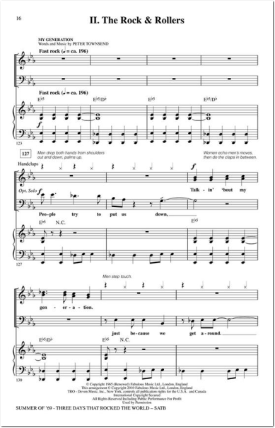 In 1969, the legendary 3-day music festival Woodstock defined a generation and gave us unforgettable musical performances from groups like The Who; Crosby, Stills and Nash; Jefferson Airplane; Blood, Sweat and Tears and more. This powerful 16-minute medley is divided into four flexible sections and includes programming suggestions by John Jacobson. It's just like being there - without the mud! I. The Innovators - Suite: Judy Blue Eyes, Somebody To Love, Spinning Wheel, My Generation II. The Rock & Rollers - Bad Moon Rising, Evil Ways, Proud Mary III. The Balladiers - Helplessly Hoping, If I Were a Carpenter, Find the Cost of Freedom IV. The Entertainers - Silhouettes, Get a Job,At the Hop. Available separately: SATB, SAB, 2-Part, ShowTrax CD. Combo parts available digitally (tpt 1-2, asx, tbn, syn, gtr 1-2, b, dm, perc). Duration: ca. 16:00.
