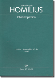 Die oratorischen Passionen von Homilius gehören zu den letzten Kompositionen dieser Art aus dem 18. Jahrhundert. Die Rolle des Chores ist in den oratorischen Passionen weitgehend auf die Choräle und Volkschöre beschränkt; lediglich die Schlüsse der Passionen bieten Gelegenheit für größer angelegte Chorsätze. In der Johannespassion greift der Schlusschor die herausragende Bedeutung der Kreuzigung im Johannes-Evangelium als Erhöhung auf. Die freien Bestandteile der Komposition bedienen sich der üblichen Formen: es überwiegen die Da-capo-Arien. Besetzung: Soli SSATB, Coro SATB, 2 Cor, 2 Fl, 2 Ob, 2 Fg, 2 Vl, Va, Bc Ausgabe: kartoniert Seiten: 128