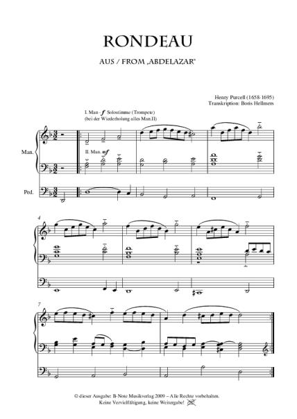 Der wohl bekannteste Ohrwurm Purcells, den schon Benjamin Britten als Hauptthema seines "Young Person's Guide to the orchestra" zu schätzen wusste, in einer leicht spielbaren Fassung für Orgel solo.