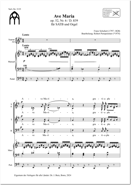 Schuberts bekanntes Sololied: oft gewünscht und vielfach bearbeitet für unterschiedlichste Besetzungen und musikalische Geschmäcker. Hier liegt nun endlich eine Einrichtung für vierstimmigen Chor vor, die den Text aus Walter Scotts „Fräulein vom See – Die Hymne an die Jungfrau“ durch das lateinische Ave-Maria-Gebet ersetzt. In dem stilvoll gestalteten Vokalsatz bewegen sich alle Stimmen in bequemer Mittellage; die Begleitung ist der Orgel (mit Pedal) auf den Leib geschrieben. Durch dieses Arrangement erhält das Werk eine neue, würdevolle Ausdrucks- und Klanggestalt.